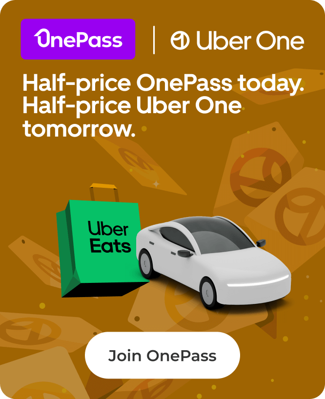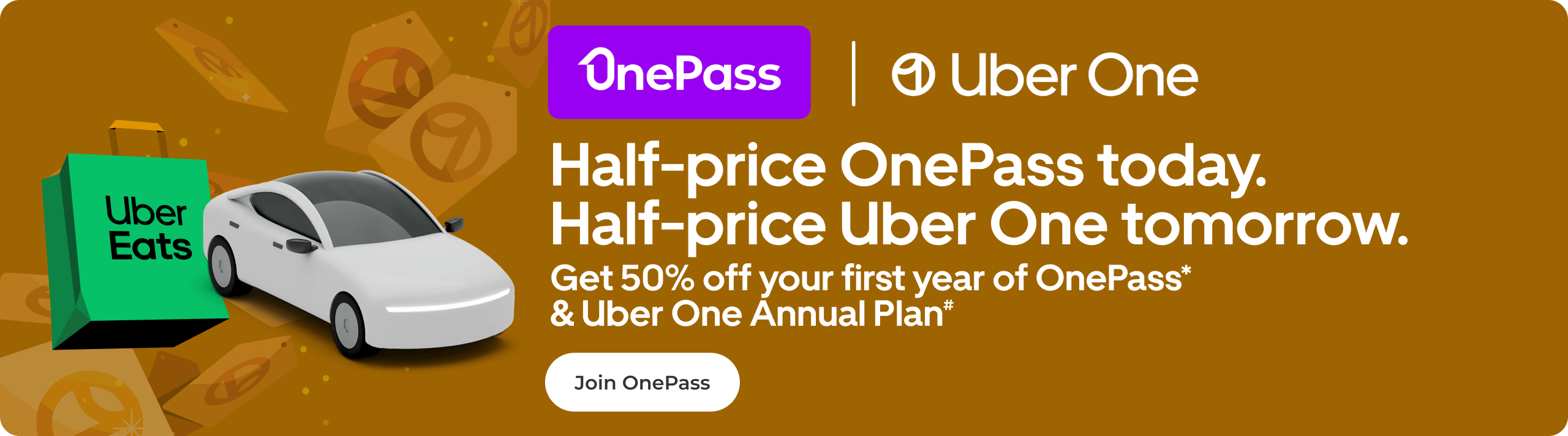*OnePass Terms, conditions, and exclusions apply. OnePass membership offer ends 11.59pm AEDT 01 December 2025, $40 per year thereafter unless cancelled, offer not available to current OnePass members. #Uber One T&Cs apply. Ends 28/11/25. Auto-renews at the then-current rate. For full details visit https://p.uber.com/OnePassUberOne