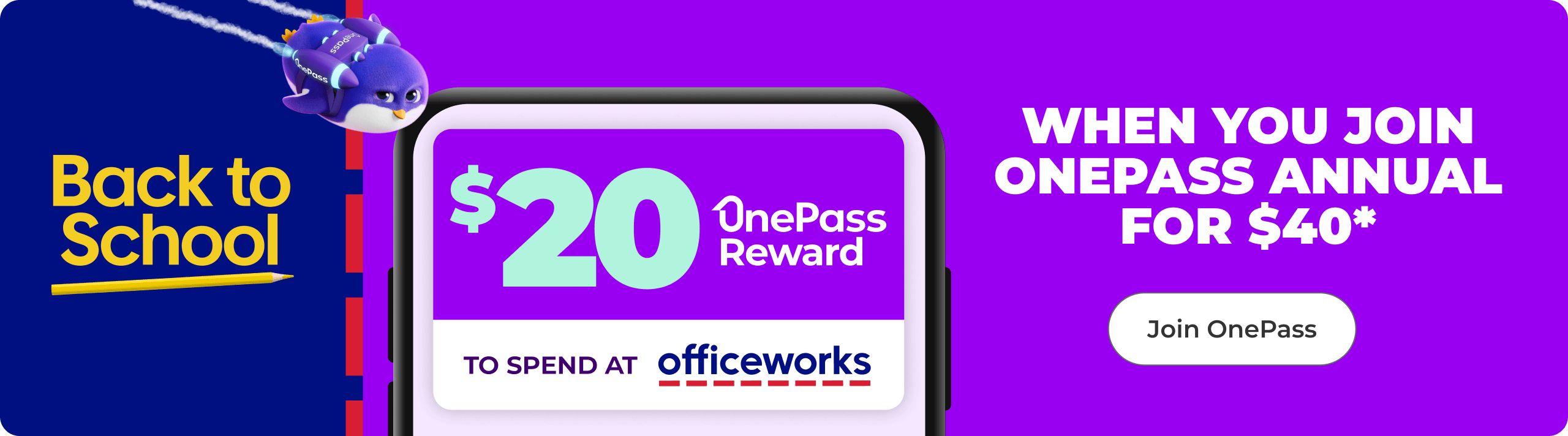 - From 8am AEDT 16th January - 6am AEDT 9th February 2026, customers who sign up for a OnePass annual membership for $40 will receive a $20 OnePass Reward to spend exclusively at Officeworks.